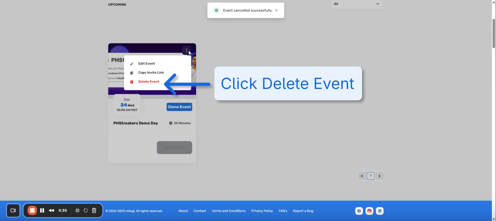 The video shows how to cancel an event first, and then optionally delete it.